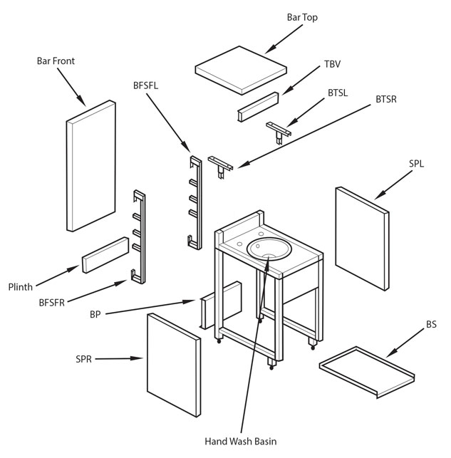 Bar Olympic units can also be used to support bar counter tops and front panels, simply by adding bar front & services supports (BFSFL & BFSFR) and bar top supports (BTSL & BTSR).